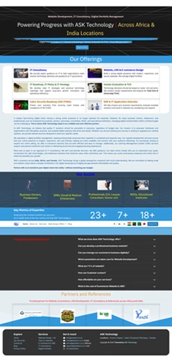 ASK Technology specializes in IT Consulting, Website Development, E-commerce & LMS development and management. Also, we manage Digital Portfolio. Also, assist in selection of right ERP and IT Application in a best rate with reputed vendor. Creating IT Roadmap, IT Strategy and IT Policies. We serve across Africa (Tanzania, Zambia), India and global markets (Canada).